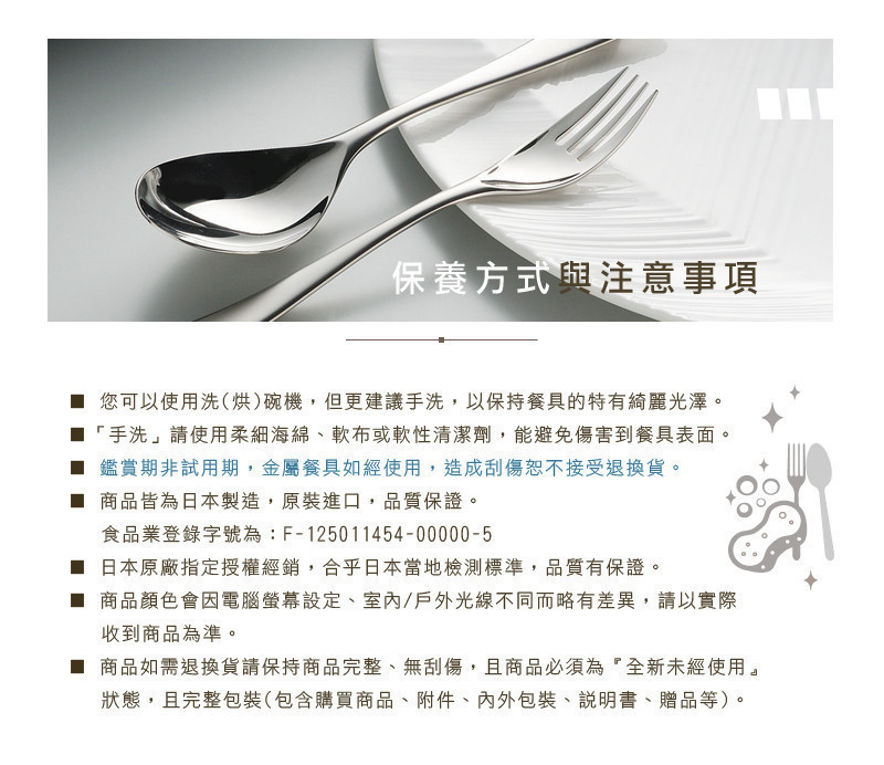 ■ 鑑賞期非試用期,金屬餐具如經使用,造成刮傷恕不接受退換貨。