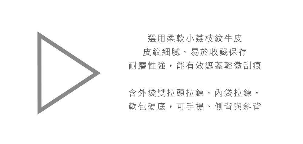 ※ 小荔枝紋牛皮是一種表面具有細小荔枝狀凹凸紋理的壓紋皮革,其特點是質感柔軟、紋理均勻,且耐磨性強,觸感舒適。能有效遮蓋使用過程中的輕微刮痕,保持美觀。