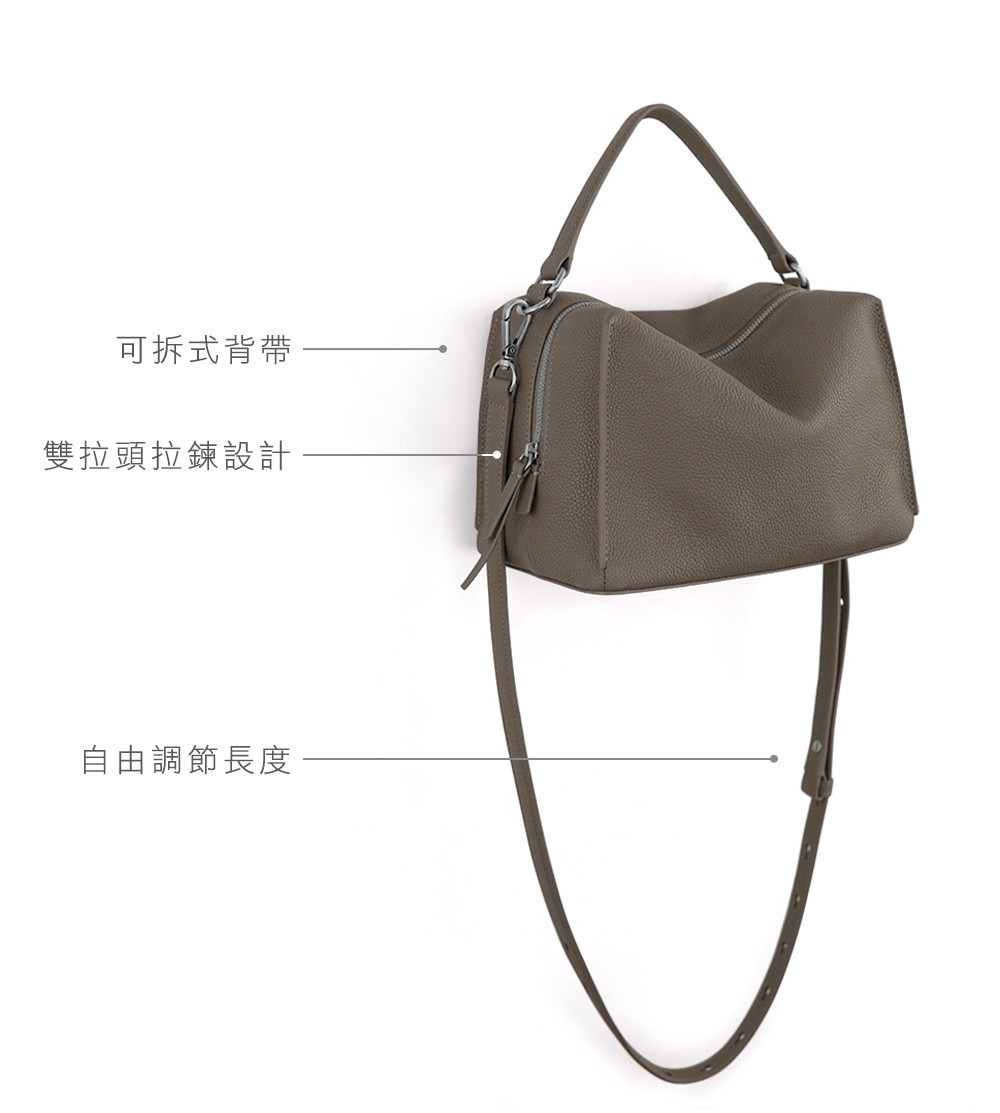 含外袋雙拉頭拉鍊、內袋拉鍊,軟包硬底的設計,可手提、側背與斜背,放長夾也沒問題,適合上班或日常使用。