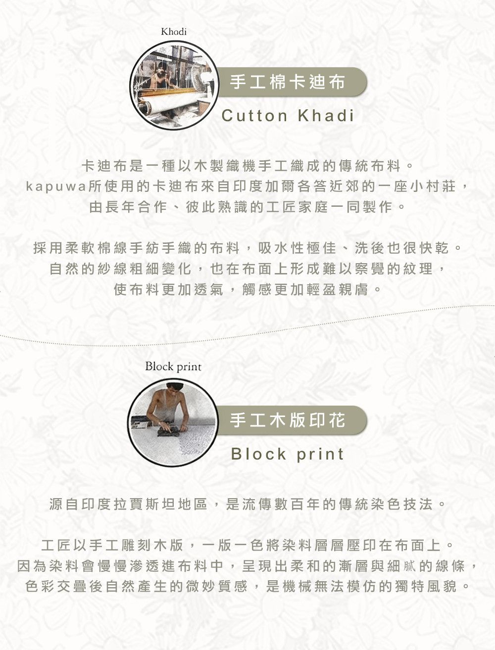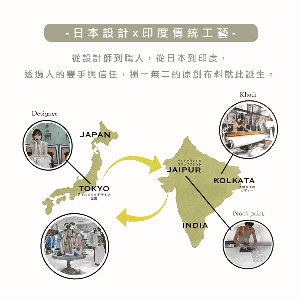 日本設計師圖案設計 + 印度職人卡迪布織造及木板印花。